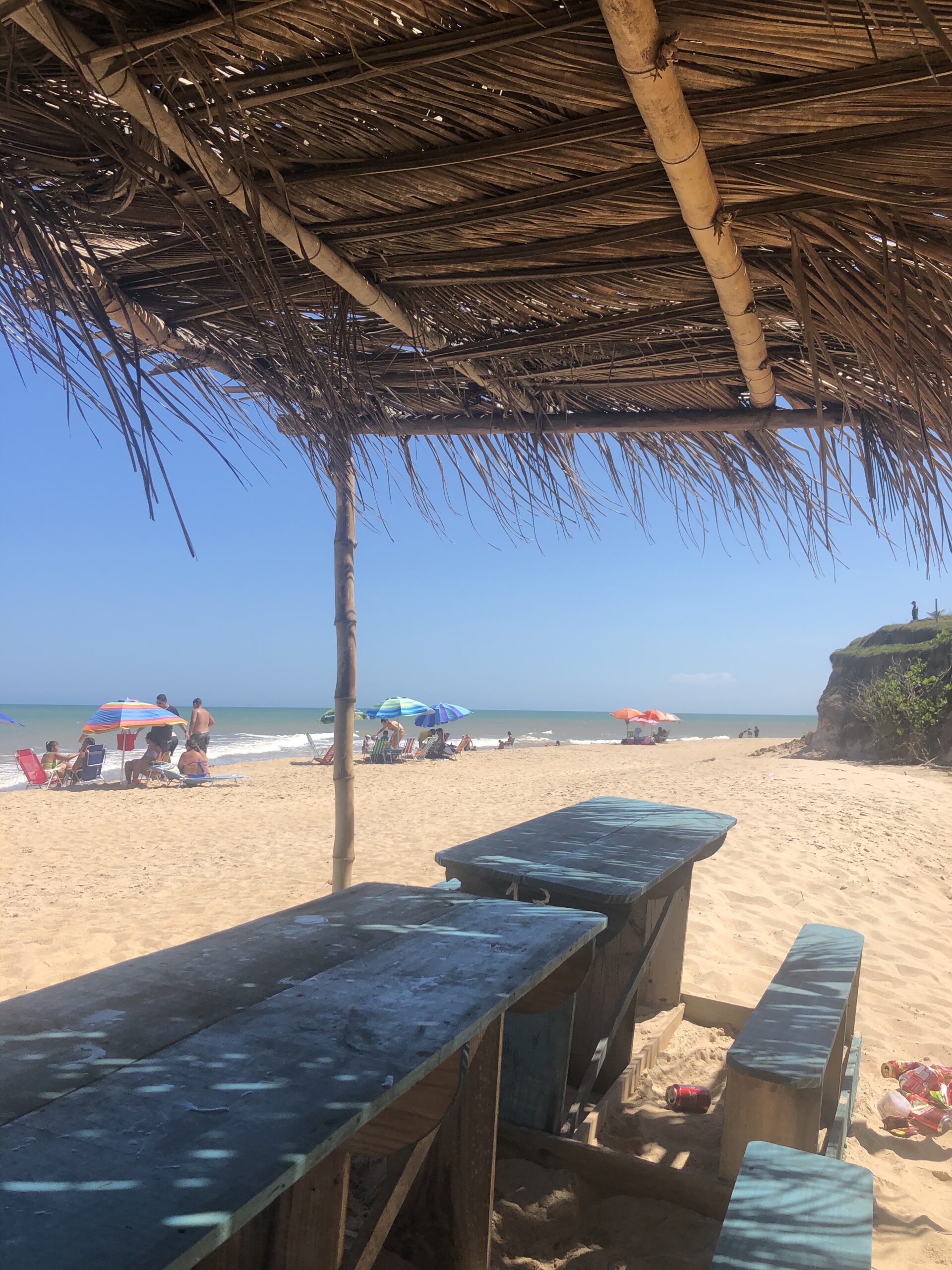Ambiente aconchegante com vista para o mar, ideal para reuniões e grupos.